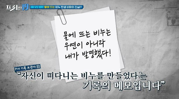 물에 뜨는 비누는 우연이 아니라 발명했다고, 자신이 떠다니는 비누를 만들었다는 기록의 메모라고.