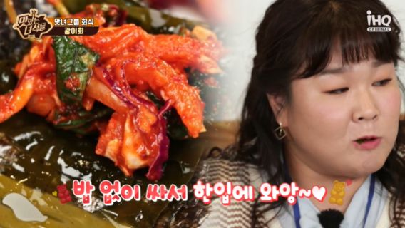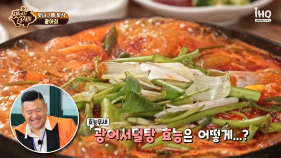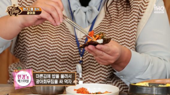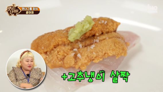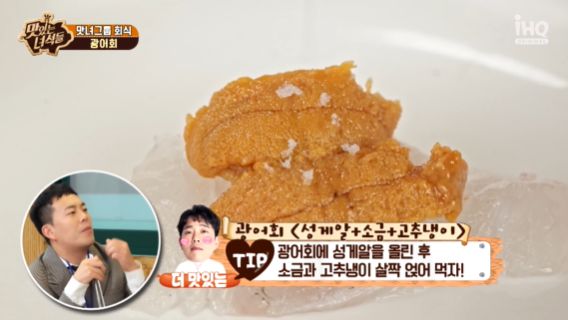 새콤달콤한 초고추장 베이스의 비법 양념에 고소한 콩가루가 더해져 환상적인 맛이라고 해요. 콩가루를 찍으니 몇 배로 고소함이 상승한다고 해요. 새콤, 달콤, 매콤까지 입맛 제대로 돋우는 광어회무침. 골뱅이무침 느낌 아니고 깨끗한 느낌의 상큼함이라고 해요. 참나물의 개운함도 좋다고 해요. 입안에서 톡톡 터지고 있던 날치알. 먹어봐야만 진정한 맛을 알 수 있다고 해요.