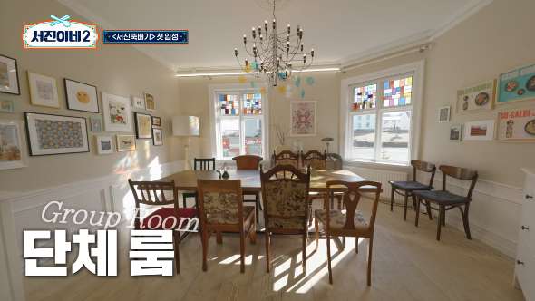 눈의 나라다운 샹들리에 장식과, 한국 전통 이미지의 조화와 햇살을 머금은 스테인드글라스까지 있는 단체룸.