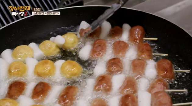 꼬치째로 튀겨준다. 소시지가 먼저 떨어져 어묵과 떡을 꽂아 만든 소떡소떡.