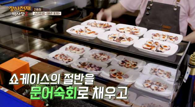 쇼케이스의 절반을 문어숙회로 채우고, 가판대 앞에 소복이 쌓인 소떡소떡과 어떡어떡.