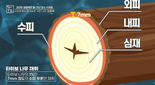타히보 나무 채취는 나무의 1% 인 7mm 정도의 수피 부분만 채취해 1~2t 의 타히보 나무 중 60~100kg 정도 채위가 가능합니다.