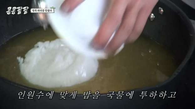 인원수에 맞게 밥을 국물에 넣고, 미리 잘라놓은 당근과 버섯까지 듬뿍 넣는다.