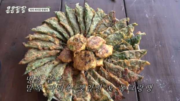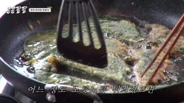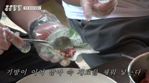경수가 깻잎에 밀가루를 톡톡 묻혀주면 기방이 이어 받아 속 재료를 채워 넣는다. 달걀을 골고루 묻힌 후 뜨거운 기름에 넣기.