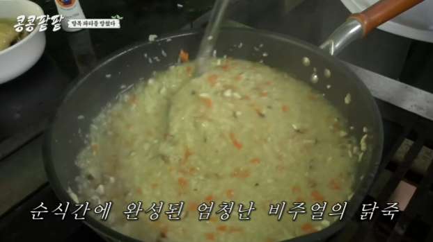참기름을 넣어주면 순식간에 완성된 닭죽.